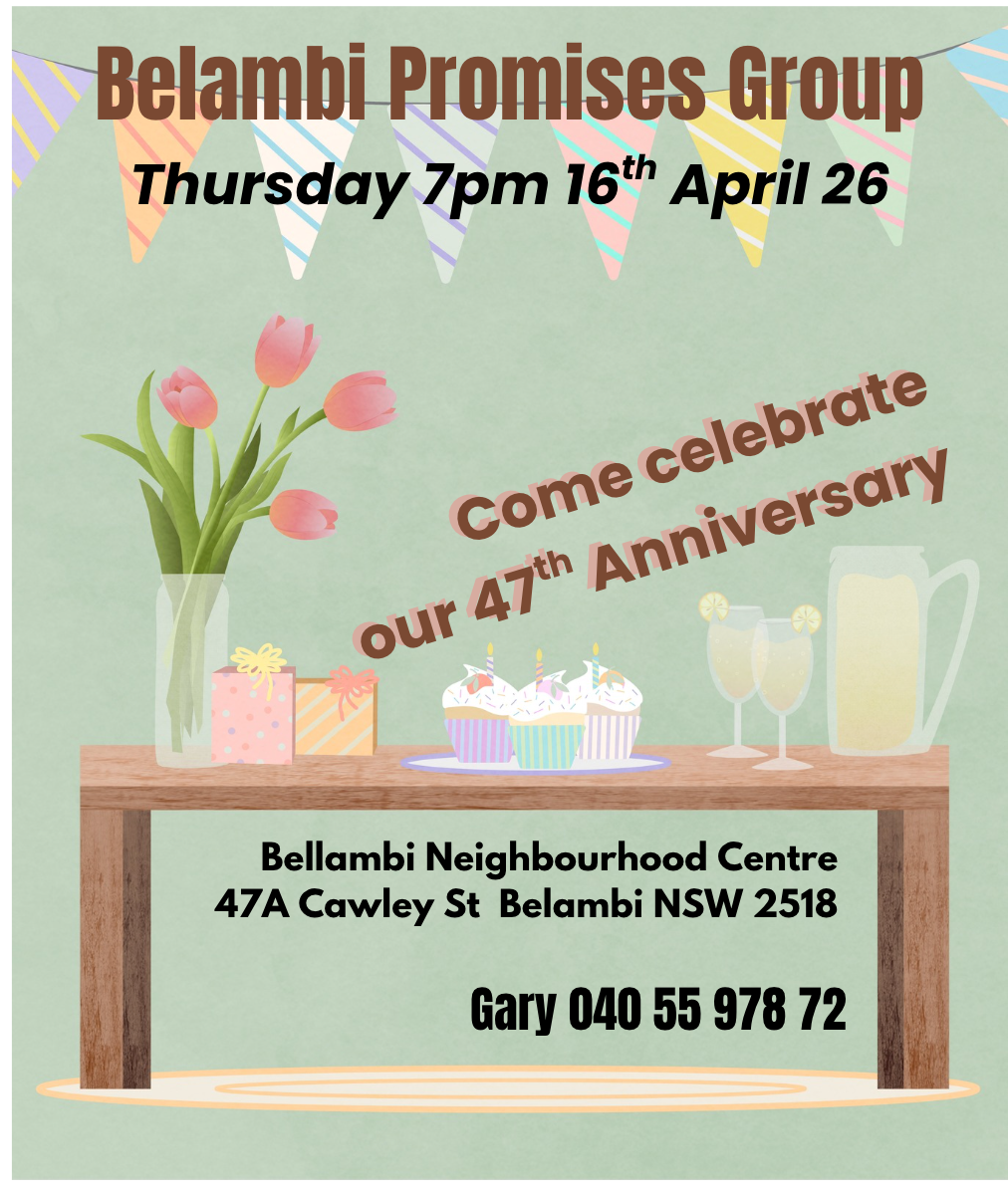 Fridays Fairy Meadow 7.00pm “Welcome to Sobriety” The Wollongong Reformed Christian Church, 96 Carters Lane, Contact Ben 0409 621 405 (90-minute ID meeting) Starting Friday 27th March 26