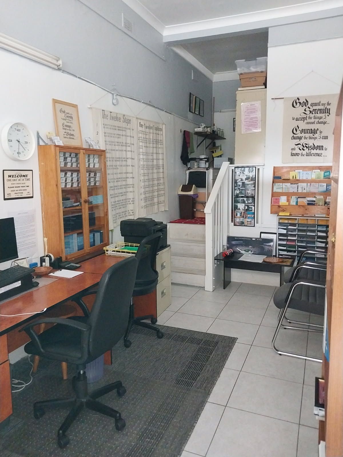 Almost opposite Coniston Railway Station, it's small and cosy (one third the space we had at Fairy Meadow), but on street level with only one step into the office itself.